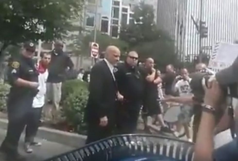 A second video showed the aftermath, included police holding the handcuffed suspect, Trump supporters berating him and also directing spirited chants of "build that wall!" and "handcuffs for Hillary!" toward Clinton supporters across the street.