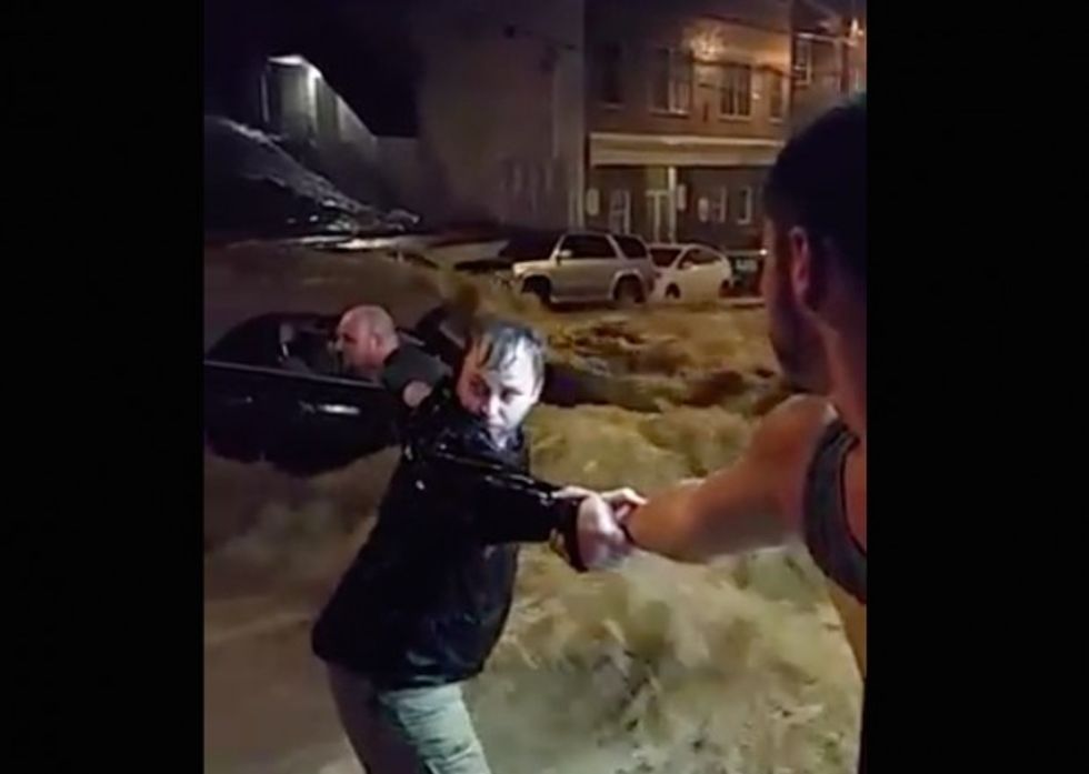 In the video, posted to Facebook by local business owner Sarah Arditti, a group of residents rally to form a human chain to save a woman trapped in her car. The footage shows the woman almost being swept away by the raging floodwaters as she attempts to drive through the torrent.