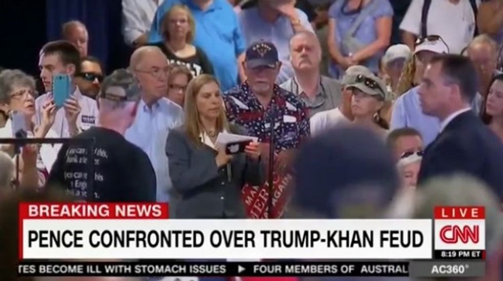 A woman who said she is the mother of an Air Force serviceman was booed at a rally for Republican vice presidential nominee Mike Pence after asking about Donald Trump’s feud with the Khan family.