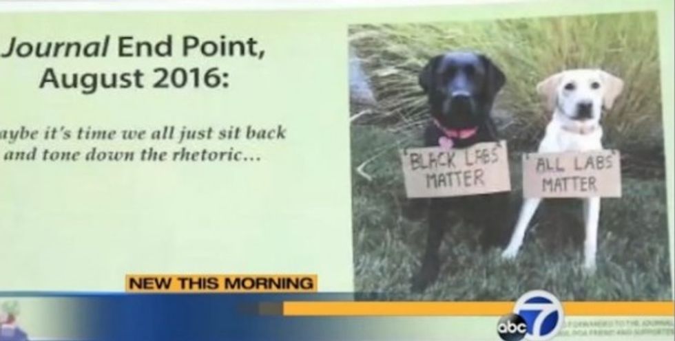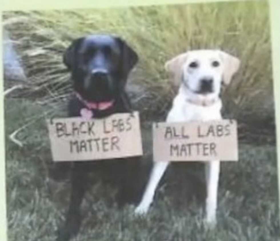 The photo on the back page of the union newsletter depicts two labrador retrievers sitting next to each other. One is a black lab; the other is presumably a yellow lab. The black lab is wearing a sign around its neck that reads "Black Labs Matter"; the other pooch is donning an "All Labs Matter" sign.