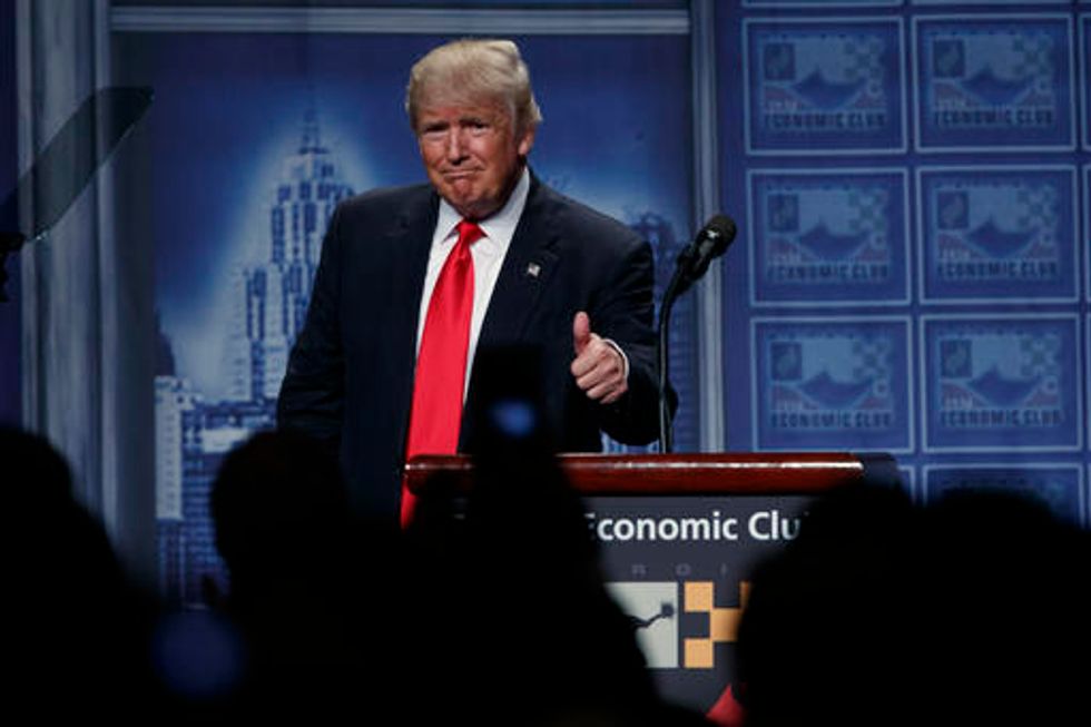 Republican presidential candidate Donald Trump delivers an economic policy speech to the Detroit Economic Club, Monday, Aug. 8, 2016, in Detroit. (AP Photo/Evan Vucci)