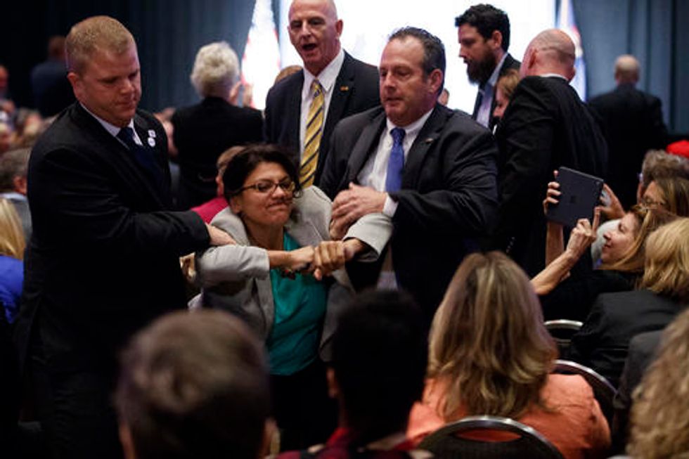 Trump was interrupted several times by female protesters but didn't engage with unruly members of the crowd. Instead, he waited and smiled while the protesters were escorted out and the crowd cheered.