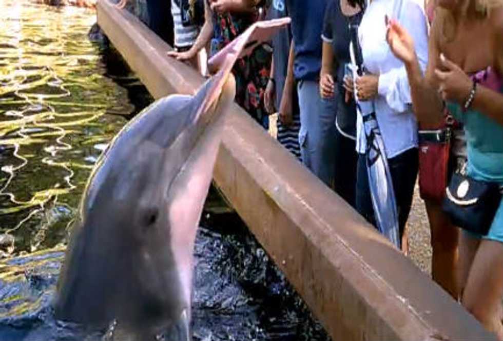 Video shot by another parkgoer shows the dolphin reaching over the side of the viewing tank at SeaWorld Orlando, where visitors can touch the dolphins. After the dolphin grabs the iPad and tosses it into the water, the woman retrieves the device and then quickly walks away.