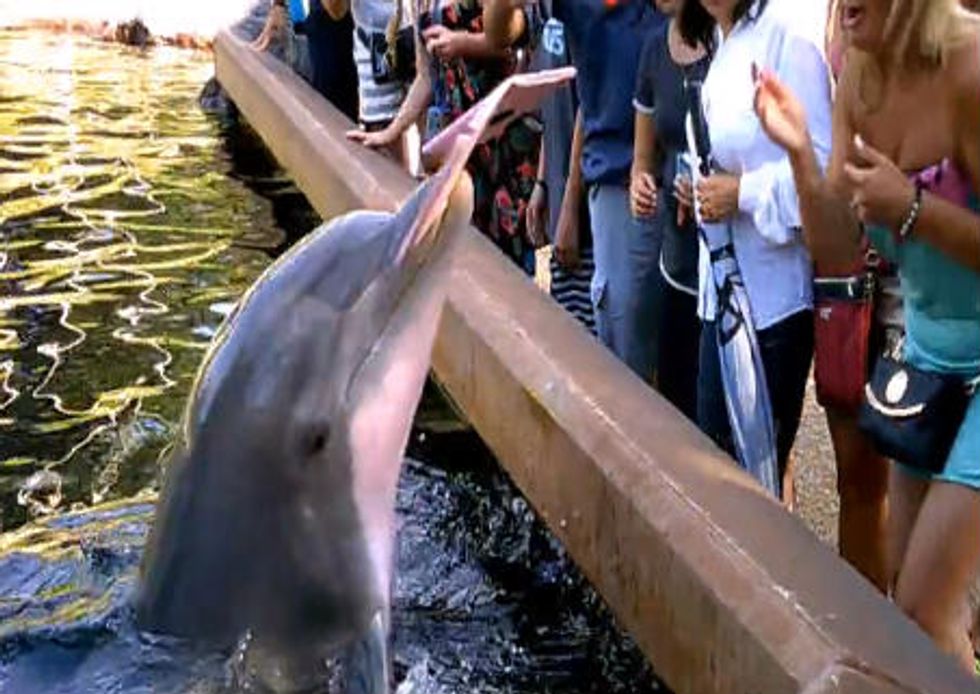 A voice can be heard over a loudspeaker saying, "As you can see, the dolphins can reach your loose items."