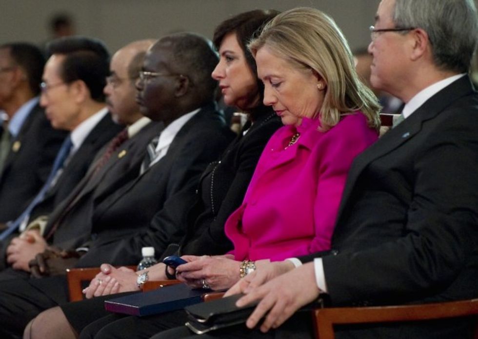 Hillary Clinton (2nd R) checks her Blackberry phone alongside Korean Foreign Minister Kim Sung-hwan (R) as she attends the Fourth High Level Forum on Aid Effectiveness in Busan, Korea, November 30, 2011. (SAUL LOEB/AFP/Getty Images)