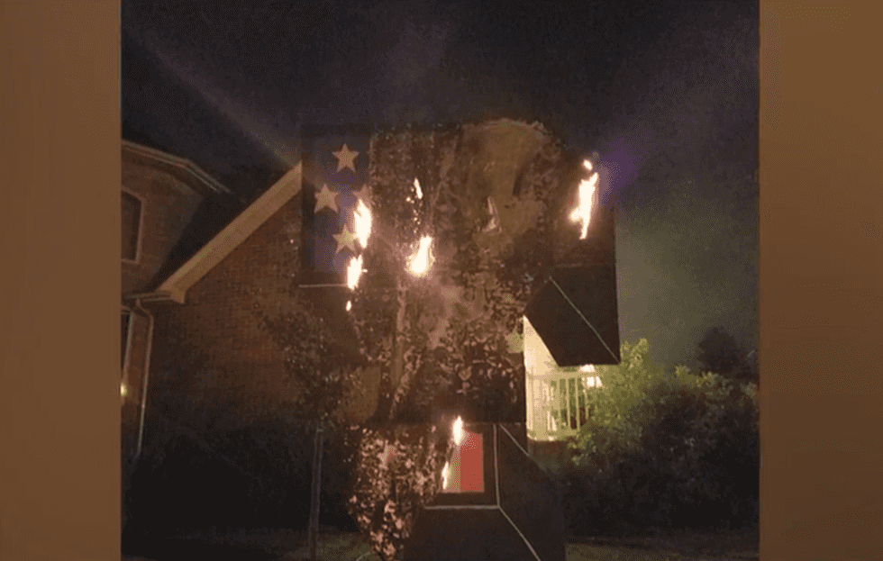 Sam Pirozzolo said he was first alerted to the fact that some "coward" had torched his sign when his daughter woke him up around 1 a.m. Sunday to tell him someone was ringing his doorbell. A few seconds later, he noticed an orange glow right outside his window.
