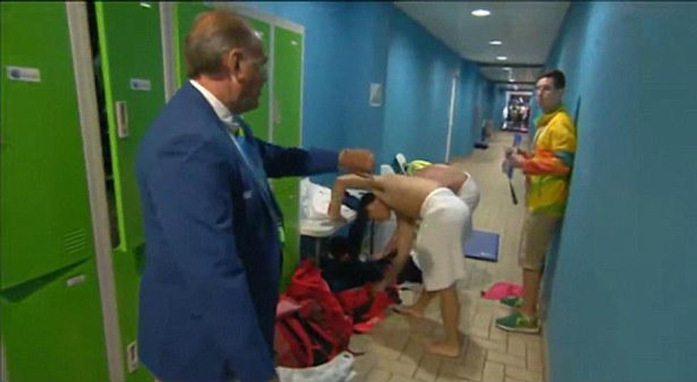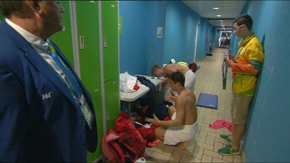 Mears was filmed in the locker room in Rio de Janeiro on Wednesday wearing a towel, moments after placing first in the synchronized 3m springboard competition, when at least one camera captured his reaction to his conundrum, as the Daily Mail highlighted.