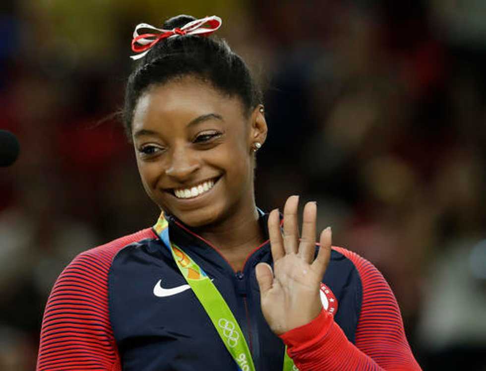 United States' Simone Biles celebrates on the podium after winning vault gold during the artistic gymnastics women's apparatus final at the 2016 Summer Olympics in Rio de Janeiro, Brazil, Sunday, Aug. 14, 2016. (AP Photo/Dmitri Lovetsky)