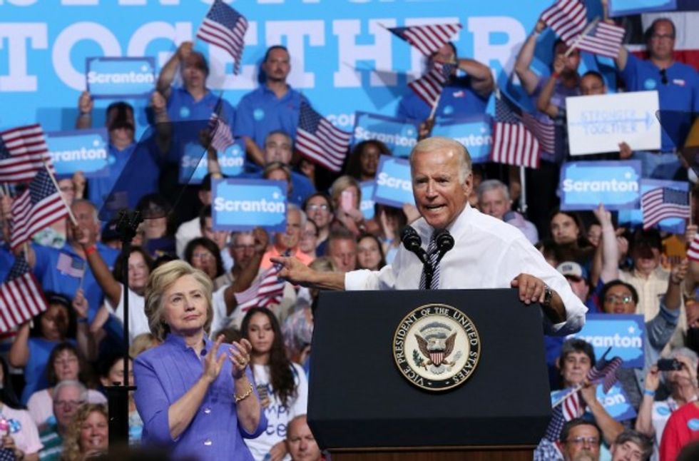 Democratic presidential candidate Hillary Clinton listens at left, as Vice President Joe Biden speaks at a campaign rally, Monday, Aug. 15, 2016, in Scranton, Pa. (AP Photo/Mel Evans)