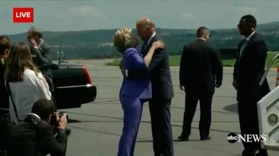 Former Secretary of State Hillary Clinton greeted Vice President Joe Biden in Pennsylvania Monday as he walked off his plane.