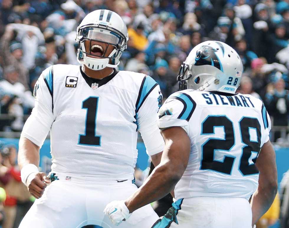 Carolina Panthers' Cam Newton (1) celebrates his team's 15-1 regular season record following an NFL football game against the Tampa Bay Buccaneers in Charlotte, N.C., Sunday, Jan. 3, 2016. The Panthers won 38-10. (AP Photo/Bob Leverone)