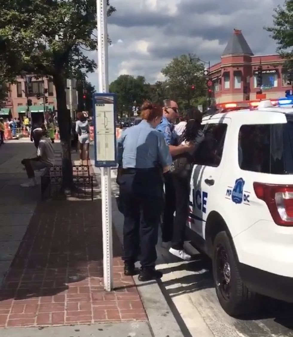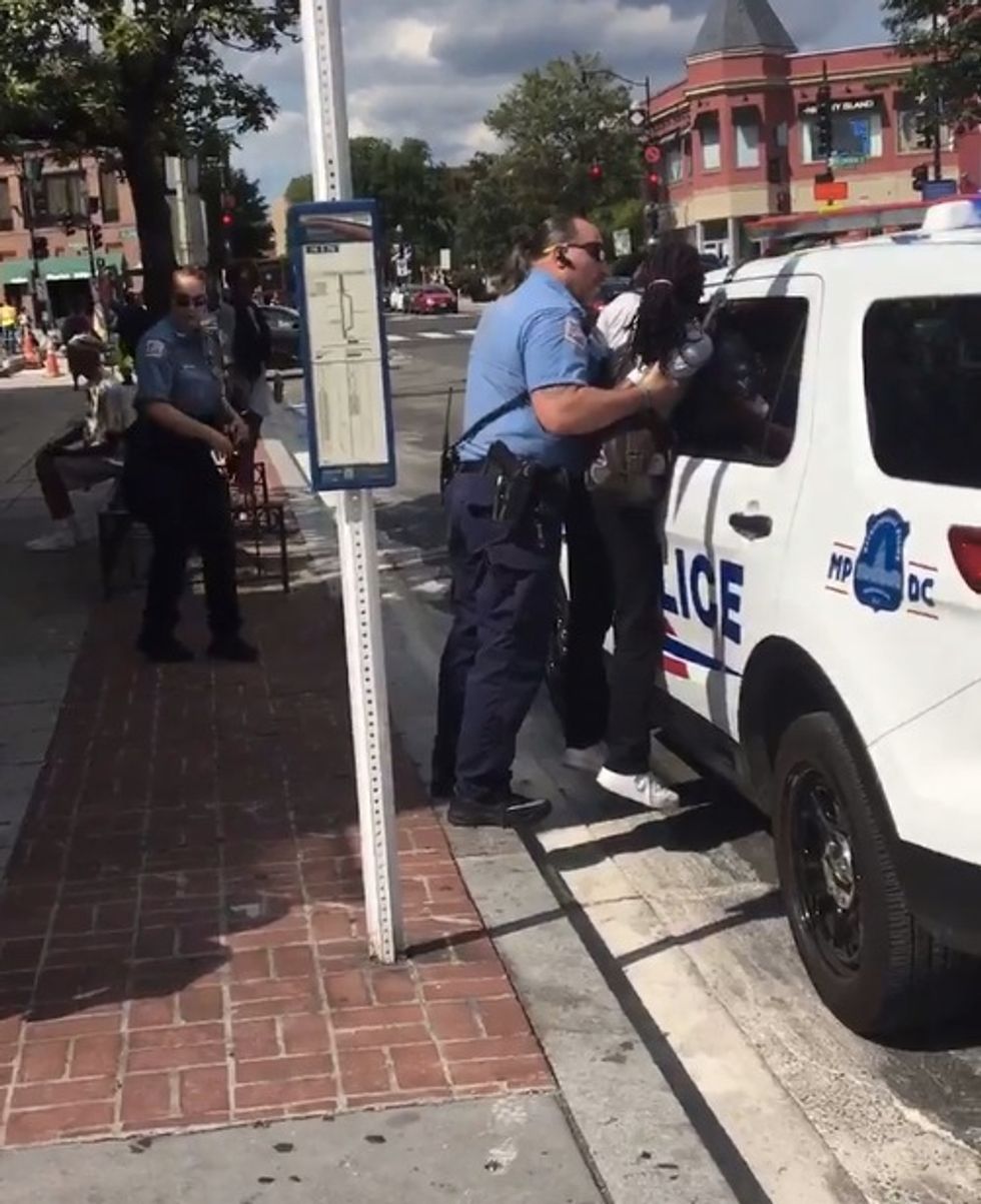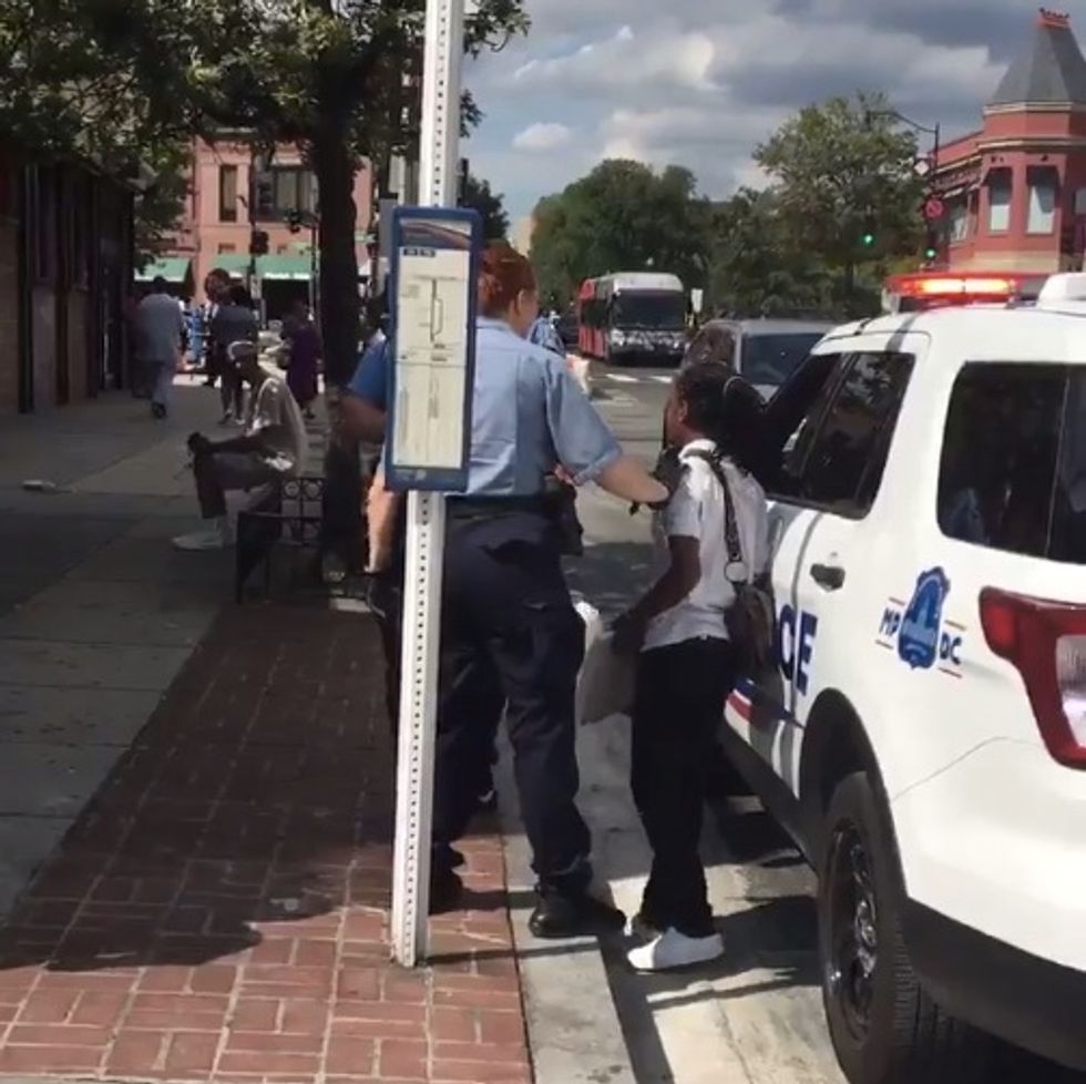 The woman told WTTG the officers likely thought of her as a threat as she was arguing with a man who was harassing another woman on the street. In the clip it appears the male officer told her "your ass is dust," which the video poster noted in Twitter comments. The WTTG video report indicated the male officer accused the woman of "prostituting herself," which she denied.
