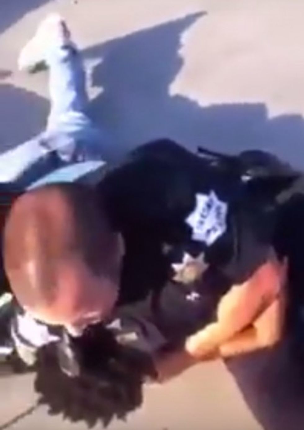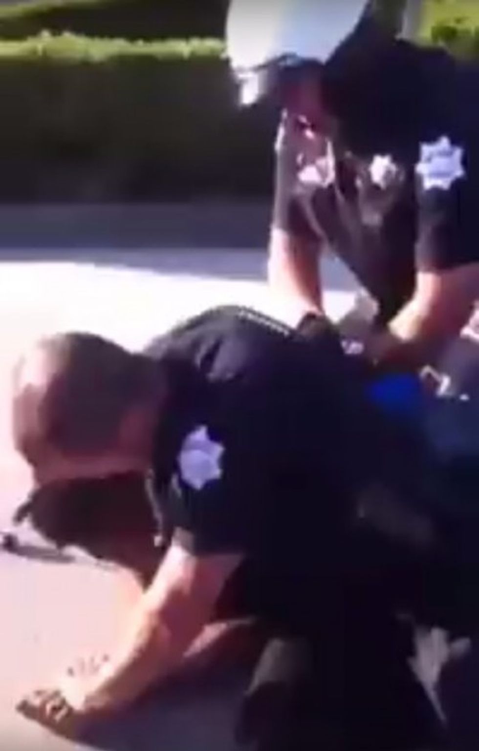 Soon another motorcycle officer arrived to assist. As the pair attempted to cuff KC, the first officer on the scene appeared to kick at the person videotaping the incident.
