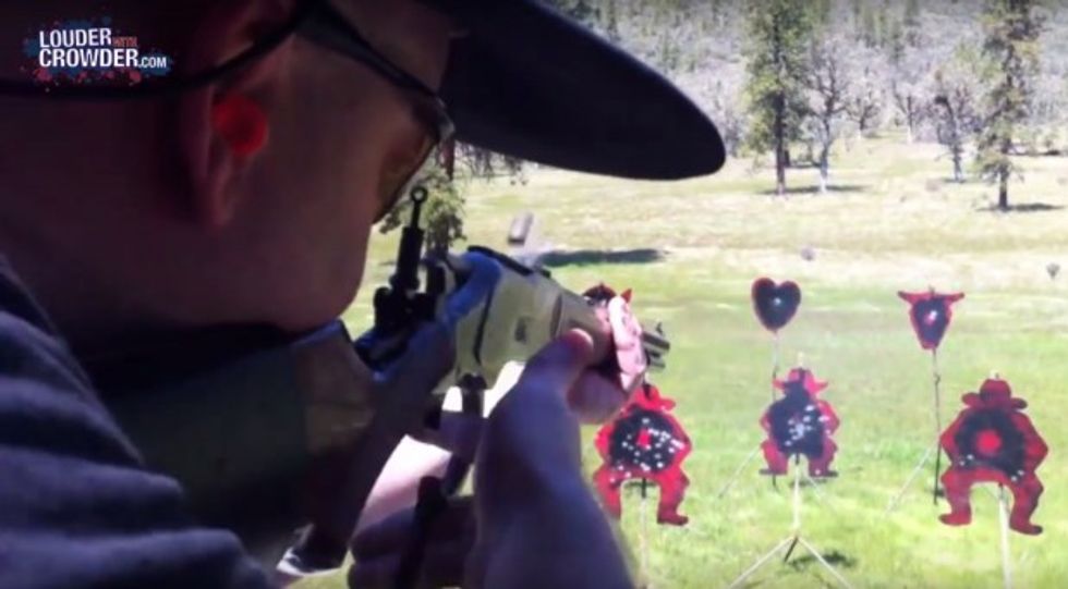 Driving home his argument further, Crowder cut to video of a man rapidly firing rounds from that same rifle at a target: