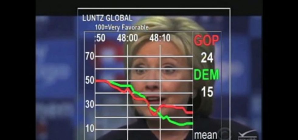 Luntz told CBS that voters held devices approximately the same size as a remote control and moved a button to indicate if they would be more or less likely to vote for that candidate based off the clip they were shown. And as Clinton continued to defend her own trustworthiness, support among both Republican and Democratic voters plummeted.