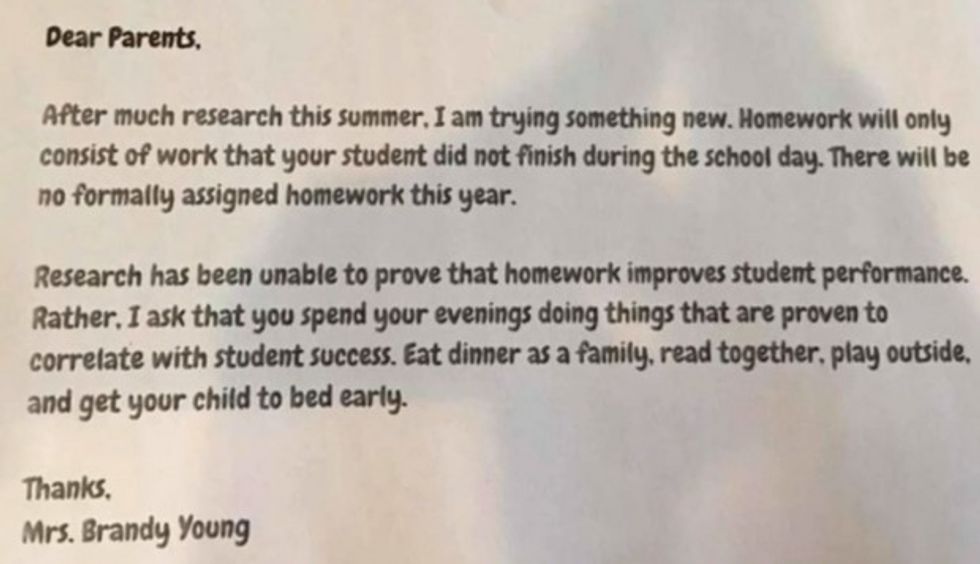 During "Meet the Teacher Night" at Godley Elementary School, KTRK-TV reported that second-grade teacher Brandy Young passed out a "New Homework Policy" memo to every parent — and it must have read like a cool breeze in the blazing August sun given that the piece of paper has since gone viral.