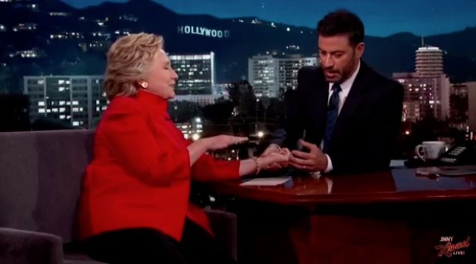 “Here, take my pulse while I’m talking to you,” Clinton told host Jimmy Kimmel. “Make sure I’m alive.”