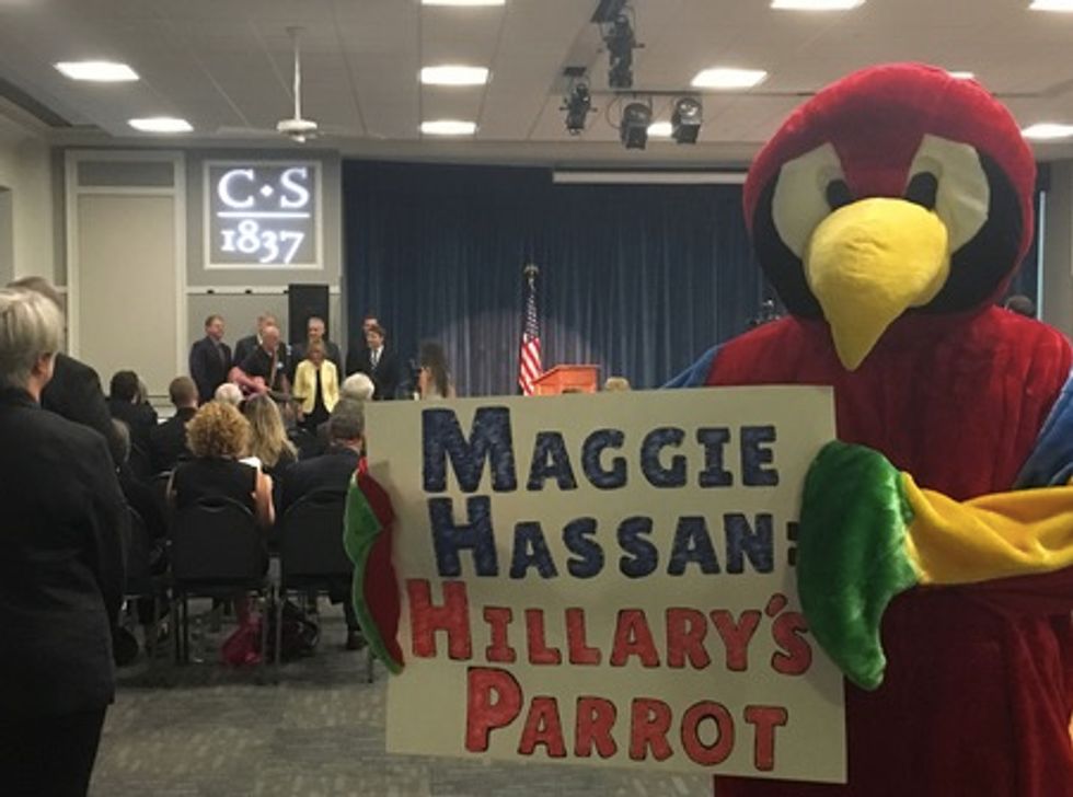 "As Hillary's parrot, Hassan will do what Hillary Clinton and the Washington Democrats who are funding her campaign tell her to do, instead of doing what's best for the people of New Hampshire," the handout, provided to TheBlaze, reads.