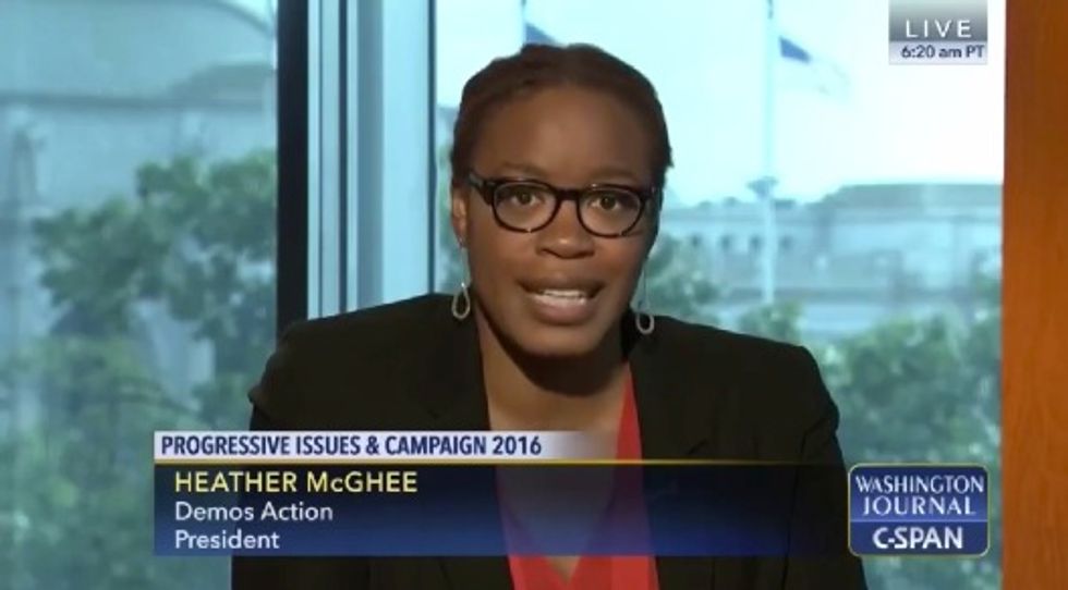 While Gary spoke, the guest, Heather McGhee, the president of Demos, a progressive public policy organization, nodded encouragingly.