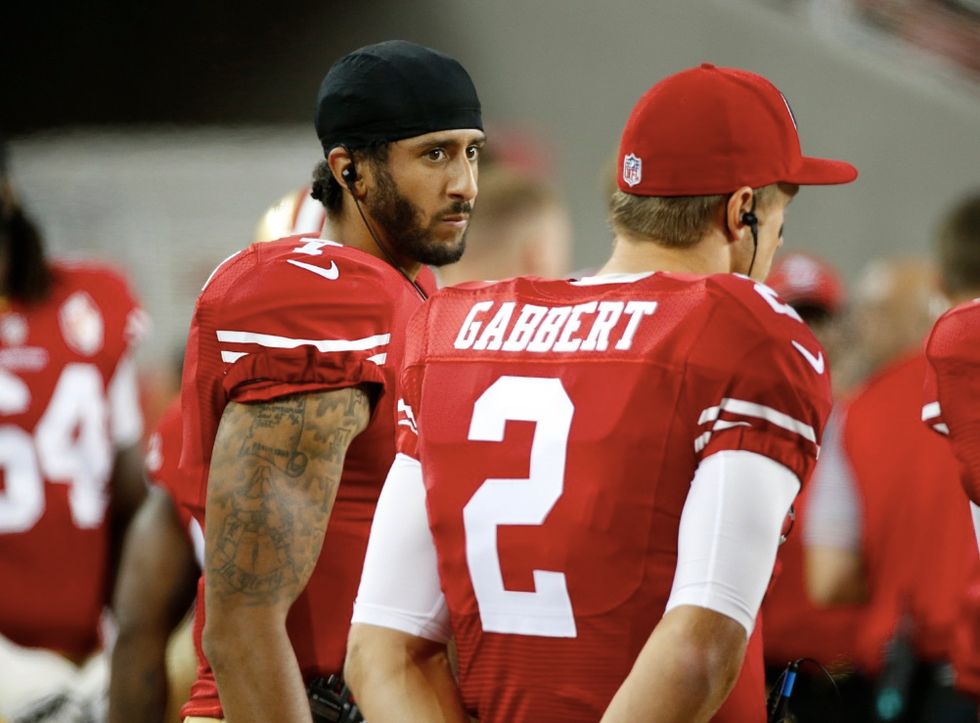San Francisco 49ers quarterbacks Colin Kaepernick, left, and Blaine Gabbert stand on the sideline during the second half of an NFL preseason football game against the Green Bay Packers on Friday, Aug. 26, 2016, in Santa Clara, Calif. Green Bay won 21-10. (AP Photo/Tony Avelar)