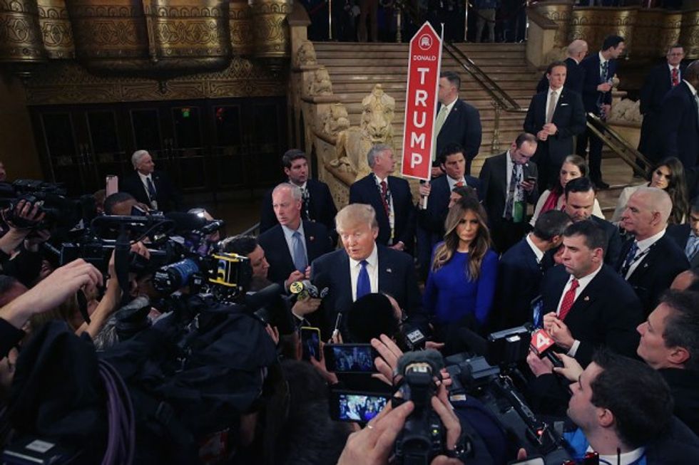 Republican presidential candidate Donald Trump greets reporters in the spin room following a debate sponsored by Fox News at the Fox Theatre on March 3, 2016 in Detroit, Michigan. (Chip Somodevilla/Getty Images)