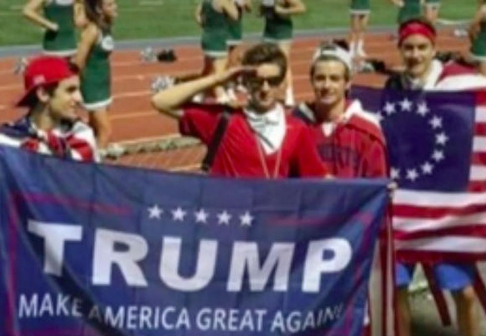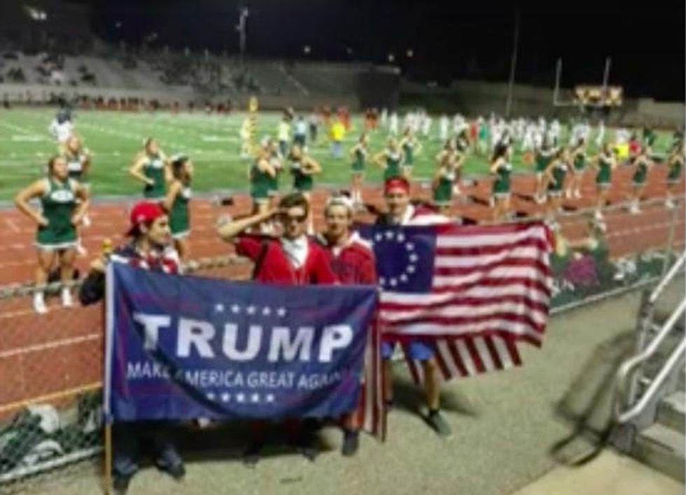 During the game between Ottawa Hills High School and Forest Hills Central High School on Friday, Forest Hills students were photographed waving two flags: one a dark blue banner with the Donald Trump campaign logo splashed across the front and the other the original 13-star Betsy Ross flag.