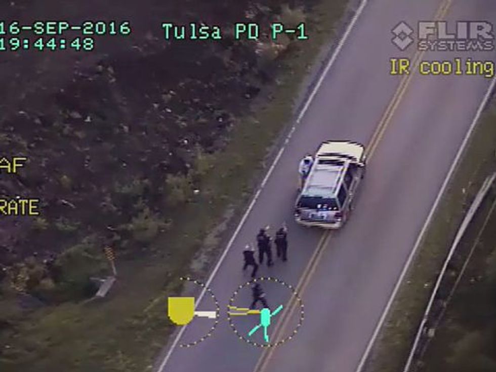TULSA, Okla. (TheBlaze/AP) -- A video from a Tulsa, Oklahoma, police vehicle shows Terence Crutcher walking toward his SUV with his hands up and a female officer following behind him.