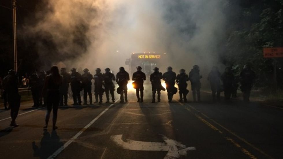 Police in riot gear block a road in the University Area of Charlotte, NC, Sept. 20, 2016. (Adam Rhew/Charlotte Magazine)