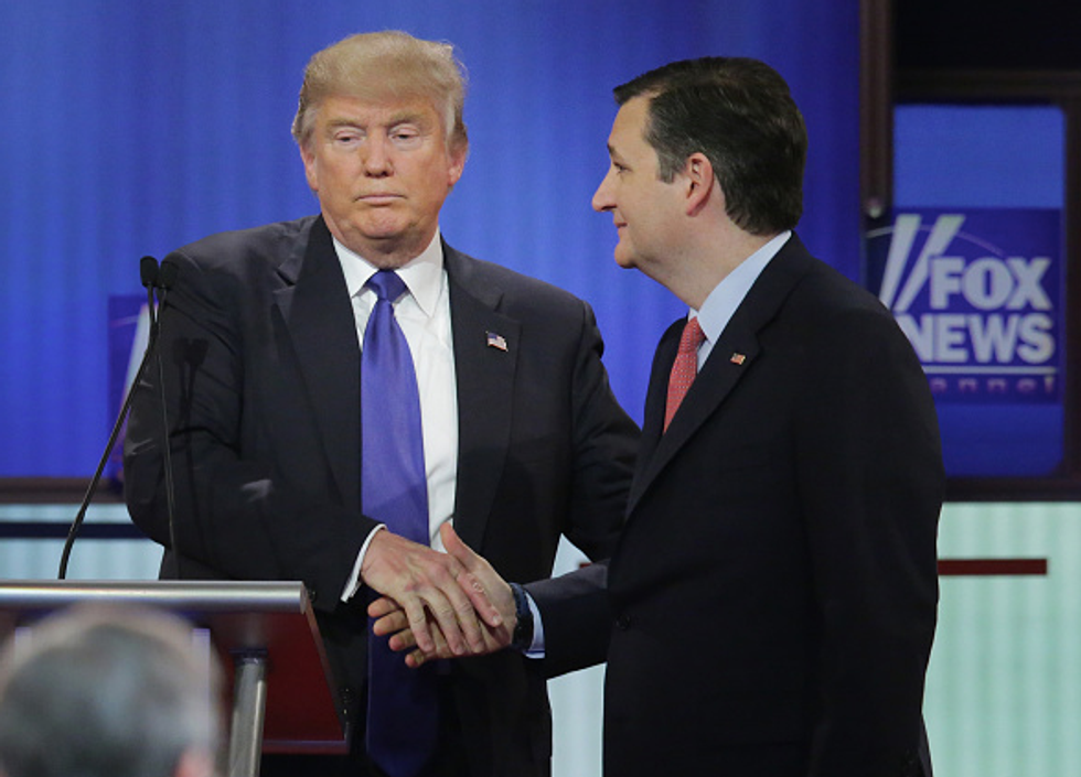 Republican presidential nominee Donald Trump and Sen. Ted Cruz greet each following a debate in March. (Getty Images/Chip Somodevilla)