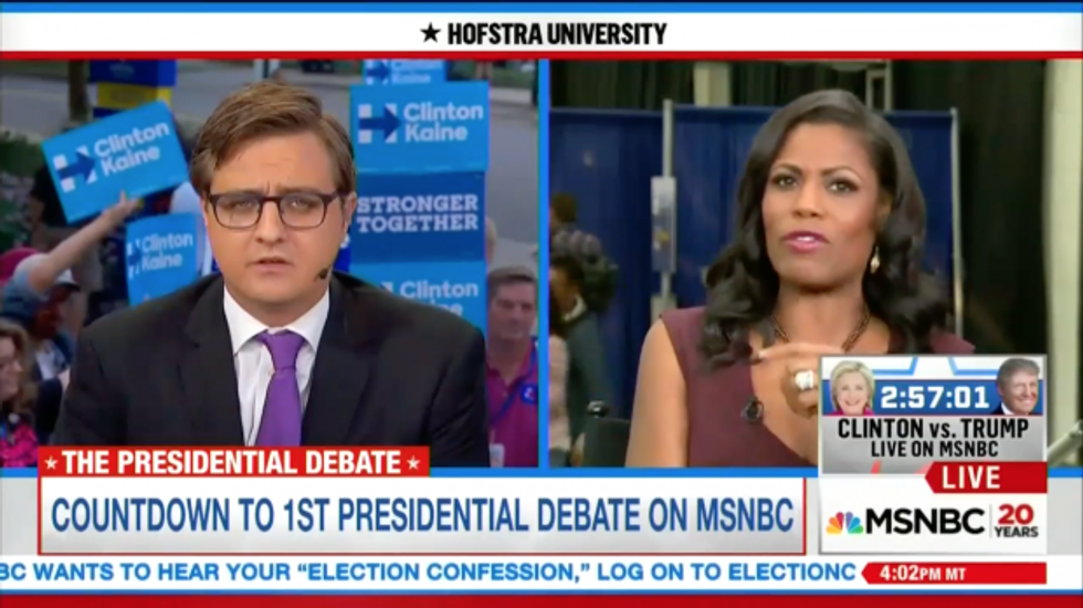 Omarosa Manigault, director of African-American outreach for Donald Trump's presidential campaign, tore into an MSNBC anchor Monday night for raising questions about so-caller birtherism ahead of the first presidential debate.