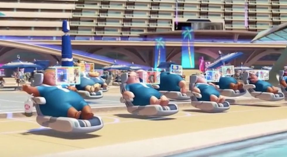 In the cartoon feature, humans are depicted as bloated and spoiled thanks to robots and technology eliminating the need for any physical activity.