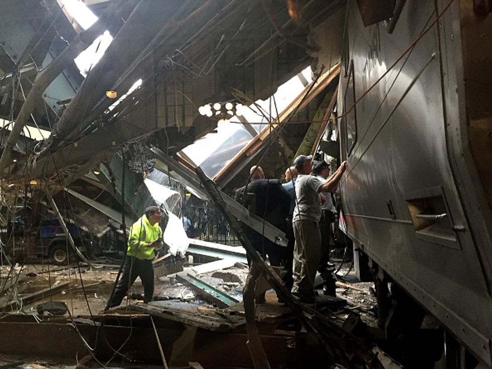 People pulled concrete off bleeding victims and passengers kicked out windows and crawled out amid crying and screaming after the arriving New Jersey Transit train smashed through a barrier at the end of its track and ground to a halt in a covered waiting area. It apparently knocked out pillars, collapsing a section of the roof onto the first car.