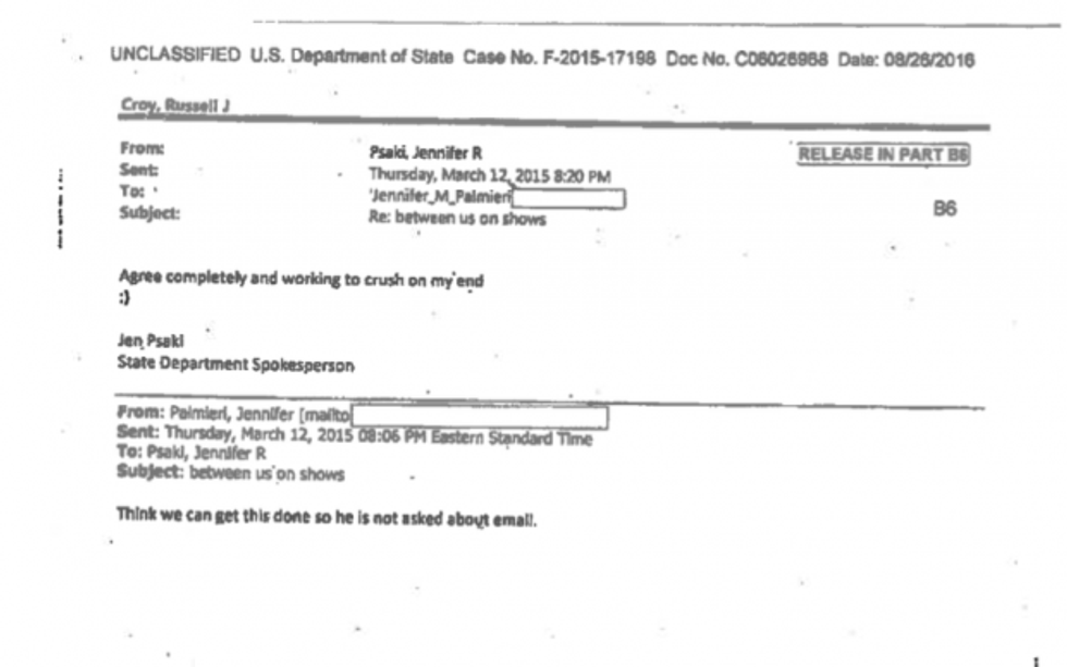 A little more than a week after the initial report of Clinton's use of a private email server broke, Palmieri emailed Psaki on March 12, 2015, to ask, "between us on the shows…think we can get this done so he is not asked about email."