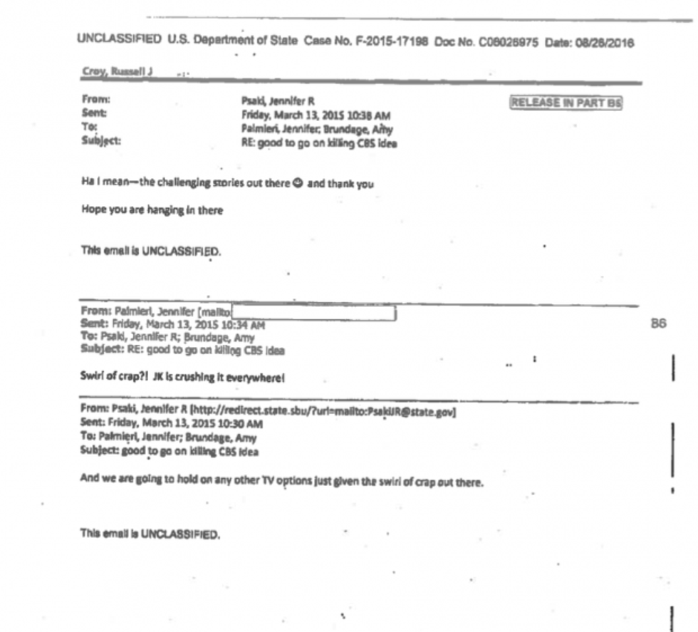 That same day, Psaki told Palmieiri she was "working to crush" those potential questions. The following morning, March 13, 2015, Psaki wrote, "good to go on killing CBS idea...And we are going to hold on any other TV options just given the swirl of crap out there."