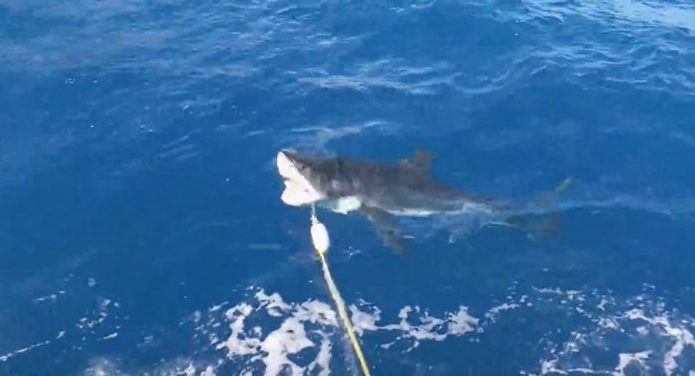Since sharks are not capable to swimming backwards, the gigantic fish is seen thrashing around inside the cage. Eventually, after the top of the enclosure was opened by deck hands, the shark found its way out of the metal cage and swam away.