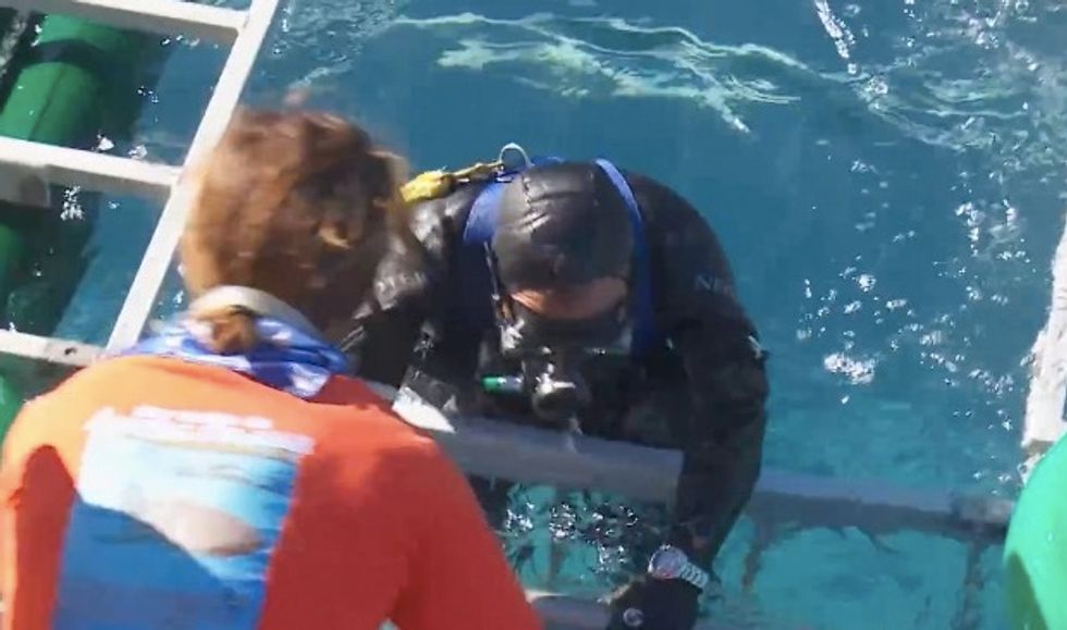 Seconds later, a diver with a professional camera rig is seen popping up from inside the cage. He reportedly escaped through the bottom and waited until the great white shark swam out of the top of the cage before returning and climbing to safety on the boat.