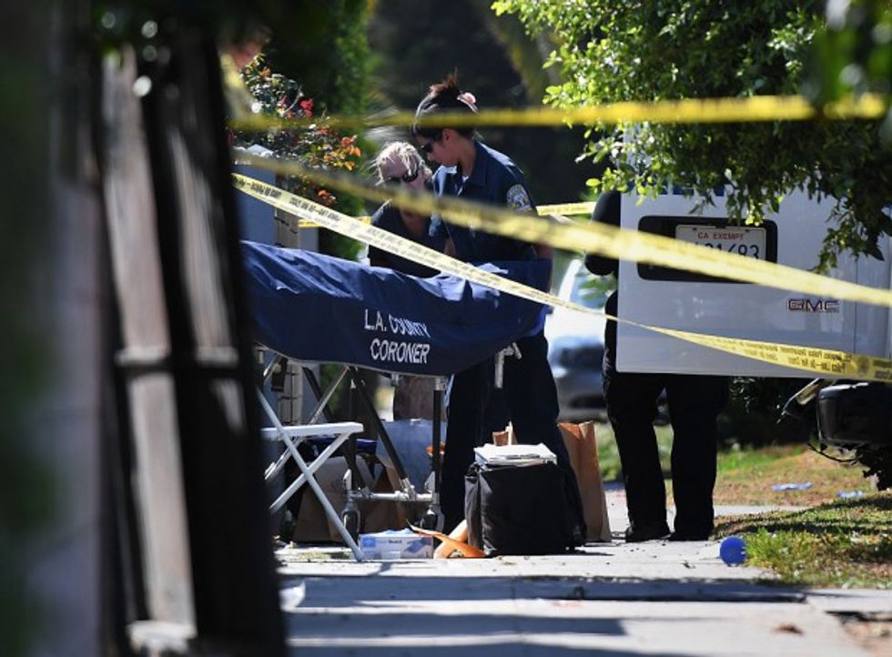 A body is removed by the Los Angeles County coroner staff after three people were killed during a shooting after a dispute at a pop-up Jamaican restaurant in Los Angeles on Saturday. (Getty Images/Mark Ralston/AFP)