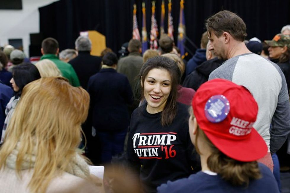 A woman wears a shirt reading 'Trump-Putin '16' before a rally for  Donald Trump at Plymouth State University, February 7, 2016, in Plymouth, New Hampshire. (Dominick Reuter/AFP/Getty Images)