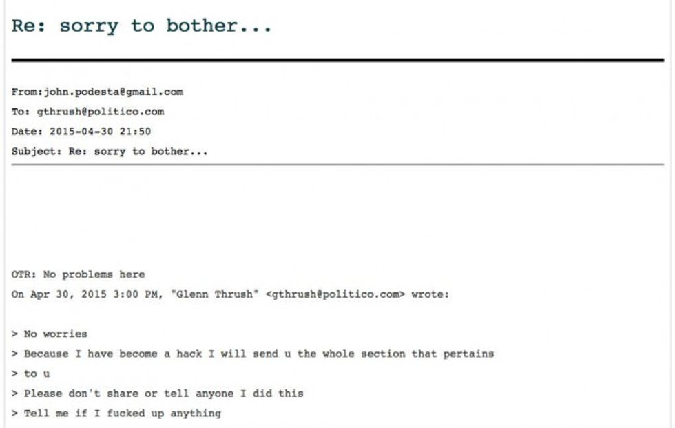 The reporter, Politico chief political correspondent Glenn Thrush, asked Podesta in an email dated April 30, 2015: