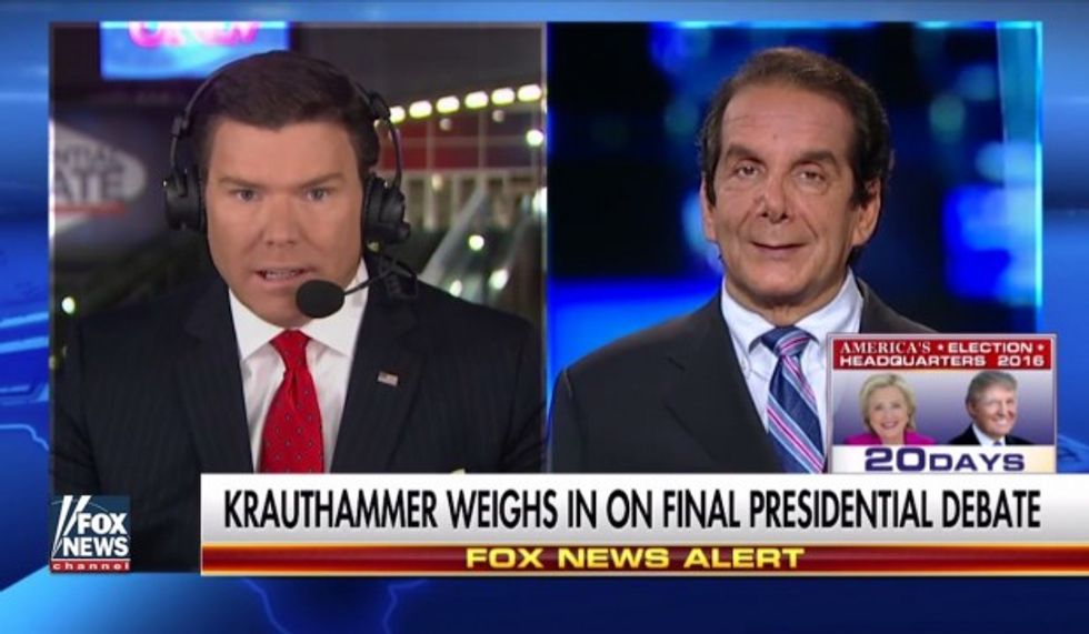"Trump had a really good night, but here the consensus is right: He blew it up with a totally wrong answer on accepting the results," Krauthammer told Fox News. "And in some sense I almost admire him for it. This was not a gaffe where you say something off the cuff and it's what you think and it's wrong."