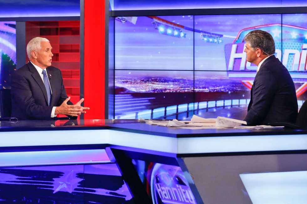 FOX News Channel's Sean Hannity, right, interviews Indiana Gov. Mike Pence after Donald Trump selected him for running mate on the Republican presidential ticket, Friday July 15, 2016, in New York. (AP Photo/Bebeto Matthews)