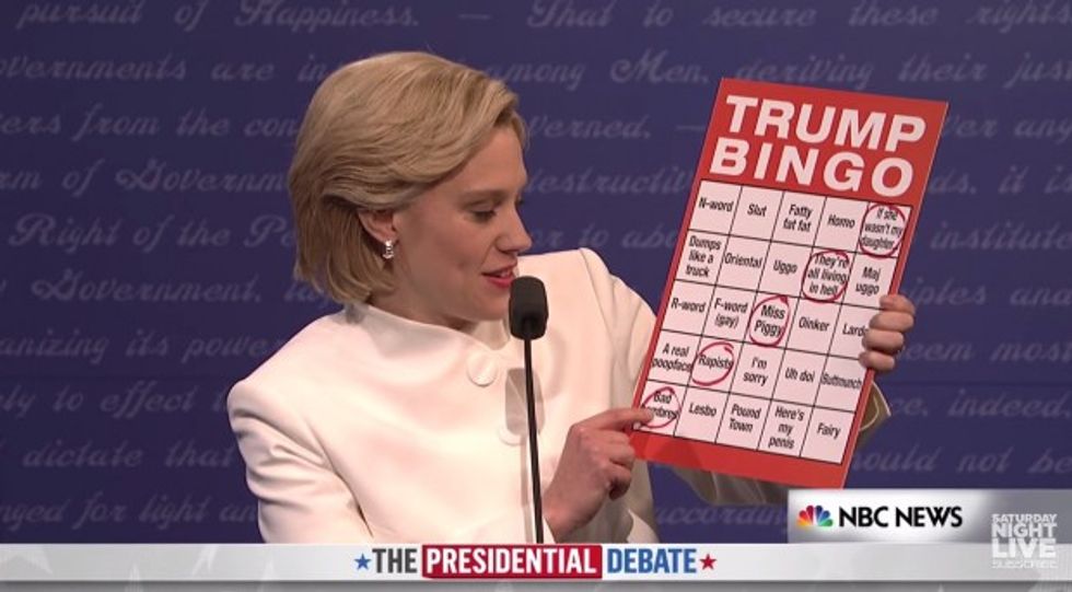 McKinnon also mocked Clinton's remarks about Russia and WikiLeaks as well as Trump's remark "bad hombres." When Adam Baldwin, who portrays Trump, made the comment, McKinnon yelled "bingo" and pulled out a bingo card. Apparently, "bad hombres" completed a row on McKinnon's "Trump bingo" card.