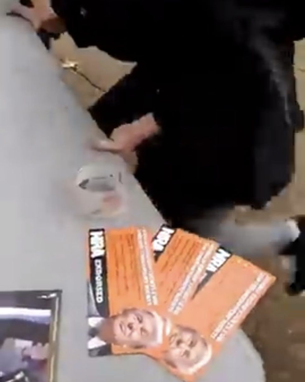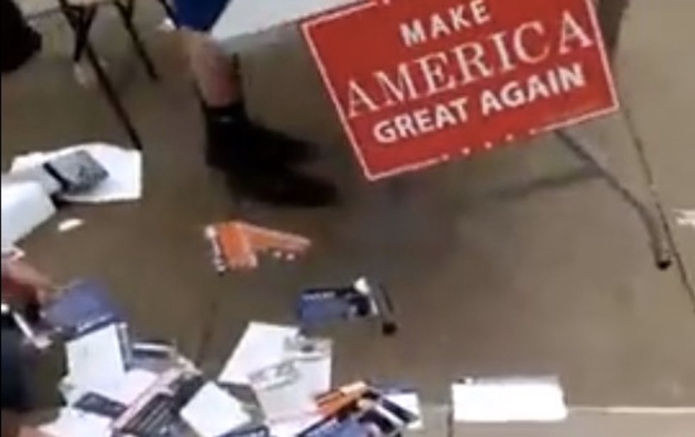 Later two students came over to the table, and one swept all the Trump literature to the sidewalk while the other flipped the table upside-down: