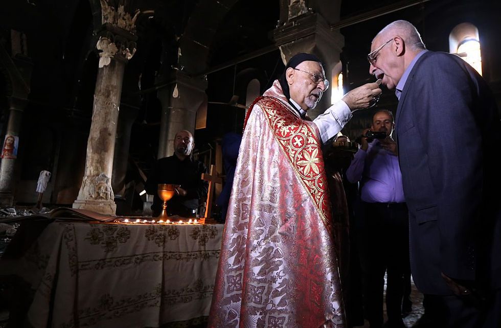 Two priests celebrated mass for dozens of worshipers in the charred remains of Iraq’s largest church after Qaraqosh was recaptured by Iraqi forces from the terrorist group.