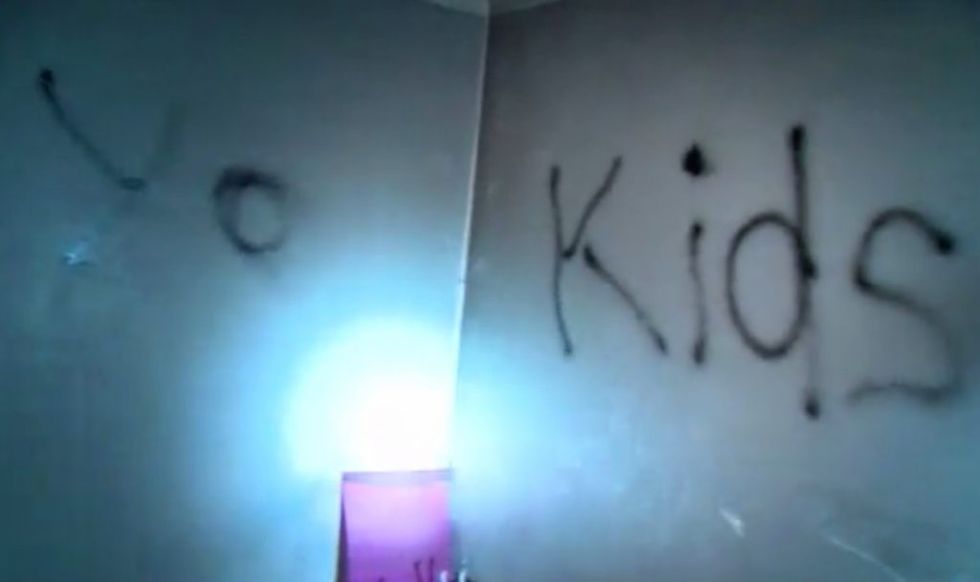— accompanied by a spray-painted greeting on a wall: "F*** yo kids."
