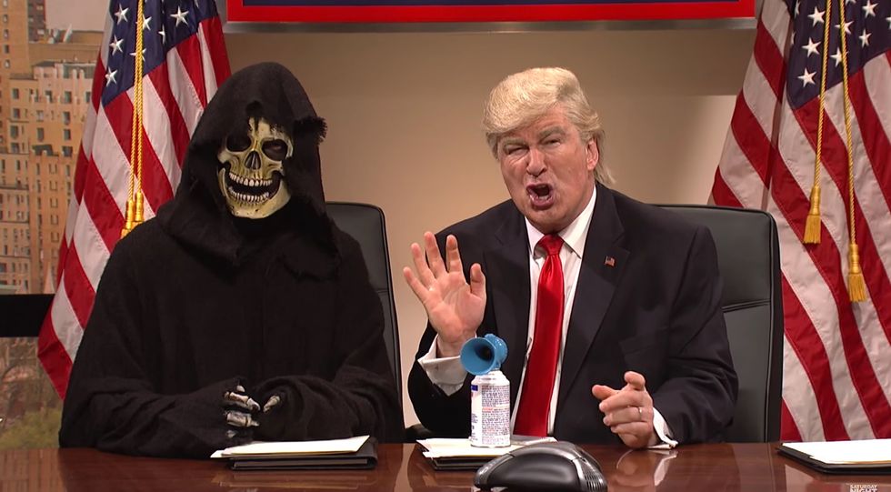 After that, Trump was finally ready to begin the intelligence meeting, except he noticed that one person from the room was missing: his chief strategist, Steve Bannon. That's when Bannon walked in, which was portrayed as someone in a "Grim Reaper" costume.