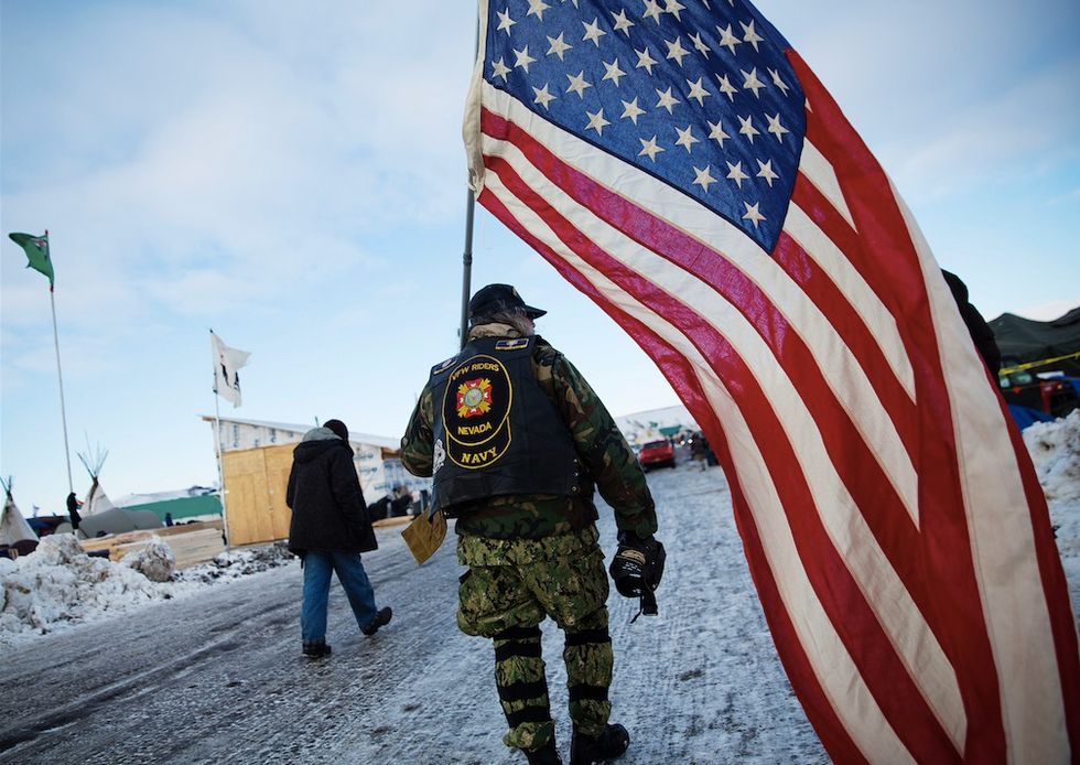 Earlier Sunday, an organizer with Veterans Stand for Standing Rock said tribal elders had asked the military veterans not to have confrontations with law enforcement officials, adding the group is there to help out those who've dug in against the project.