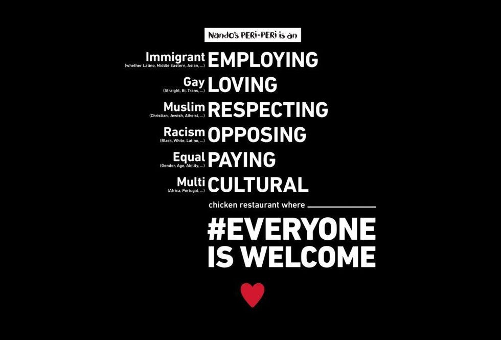 "This is a statement of who we are, and the values that our company employees hold dear," Nando's CEO Burton Heiss said. "It is meant to be as inclusive as possible. We hope that our campaign will catch on and start a conversation about understanding and respect."