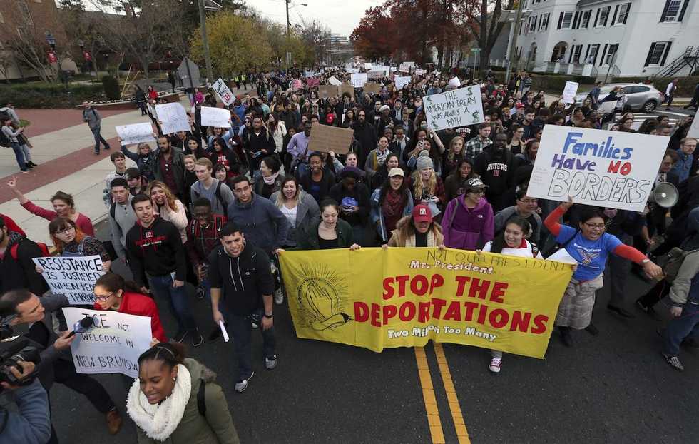 Hundreds of Rutgers University students block College Ave., in New Brunswick, N.J., as they march to protest some of President Donald Trump's immigration policies. (AP/Mel Evans)