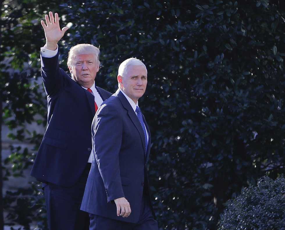 President Donald Trump, accompanied by Vice President Mike Pence, waves to members of the media as they walk to the Oval Office Wednesday. (AP Photo/Pablo Martinez Monsivais)